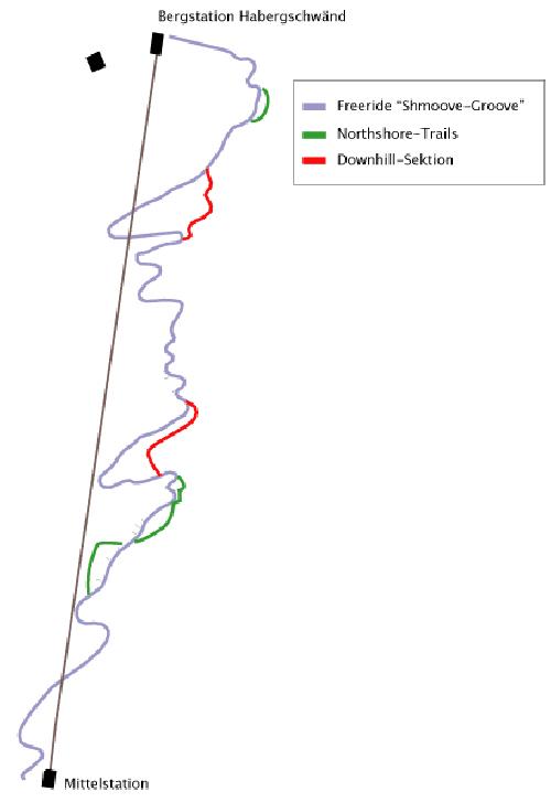 Die rund anderthalb Kilometer lange Freeridestrecke "Shmoove-Groove" führt von der Bergstation Habergschwänd mit einem durchschnitllichen Gefälle von 20 % zur Mittelstation. Auch für weniger geübte FahrerInnen ist die Strecke gut zu meistern. Wer keine Flugangst hat und ein wenig schneller unterwegs ist, kommt ebenfalls auf seine Rechnung. Mit Rücksicht auf die Landbesitzer bitten wir Euch vorerst von der Mittelstation über die Teerstrasse zum Parkplatz zurückzufahren. Eine wunderbare Gelegenheit, Manuals zu üben. Wir suchen zurzeit nach einer Möglichkeit, die Talabfahrt in Zukunft für uns alle attraktiver zu gestalten. Vielen Dank für Euer Verständnis!