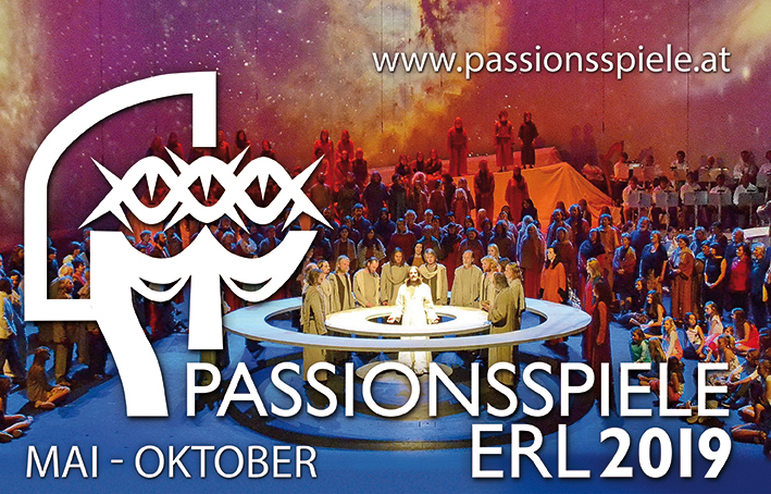 Alle sechs Jahre beteiligen sich rund 600 Laiendarsteller der 1450 Einwohner der Gemeinde Erl. Gespielt wird am Sa und So Nachmittag, von 13:00 bis 16:00 Uhr im 1500 Sitzplatz fassenden Passionsspielhaus. Aufführungen vom 26.Mai bis 05. Oktober 2019
