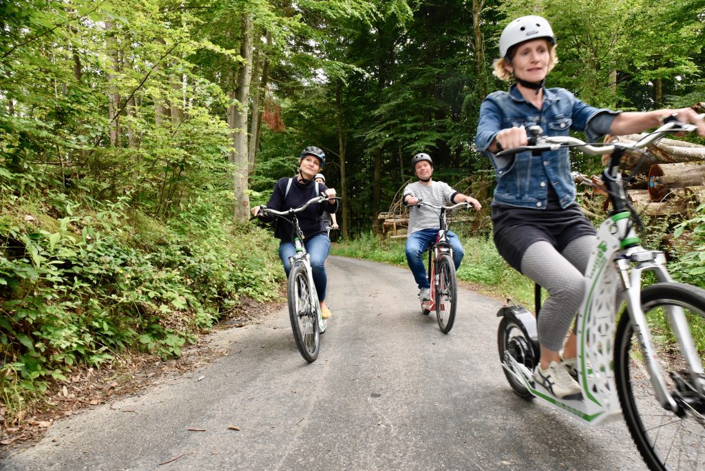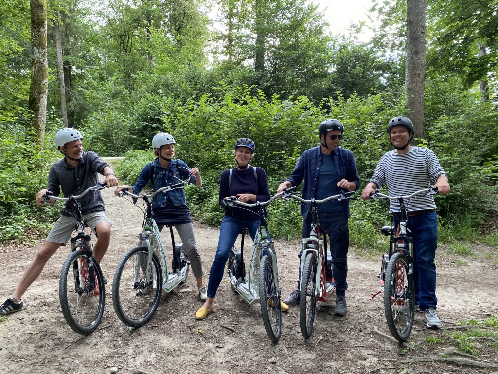 Trottiplausch der Extraklasse – mieten Sie ein Elektrotrotti für einen Ausflug als Einzelperson oder als Gruppe und entdecken Sie Burgdorf und die Umgebung des Emmentals. Es stehen bis zu 21 E-Scooter für Ihre Gruppe bereit. Mit den Hugo Bikes (Mischung aus Elektro-Velo und Trottinette) drücken Sie den Powerknopf und der Spass geht los. Das Trottinett beschleunigt auch bergauf flott und bietet durch das grosse Vorderrad eine Laufruhe die sich gerade auch bei nassen und Naturstrassen als Vorteil erweisen.